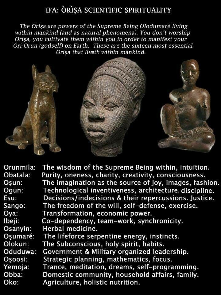 The colours correspond to a cosmic energy which is personified as a god or Orisha. Similar correspondences are found in Kemetic Spirituality. The colours also correspond to the elements – earth, water, air, fire. There are many Orishas but there are the most popular ones.